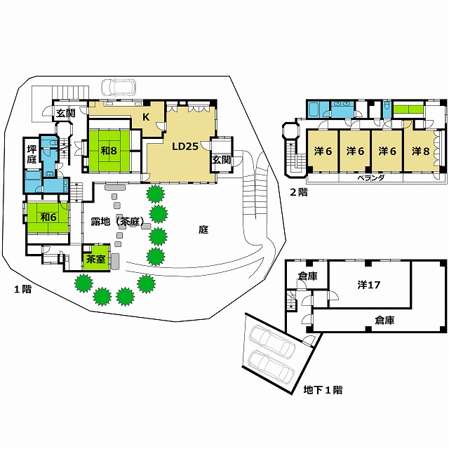 間取りは6LDK+地下多目的スペース・倉庫、電動シャッター付きガレージはビルトインで2台の駐車が可能。